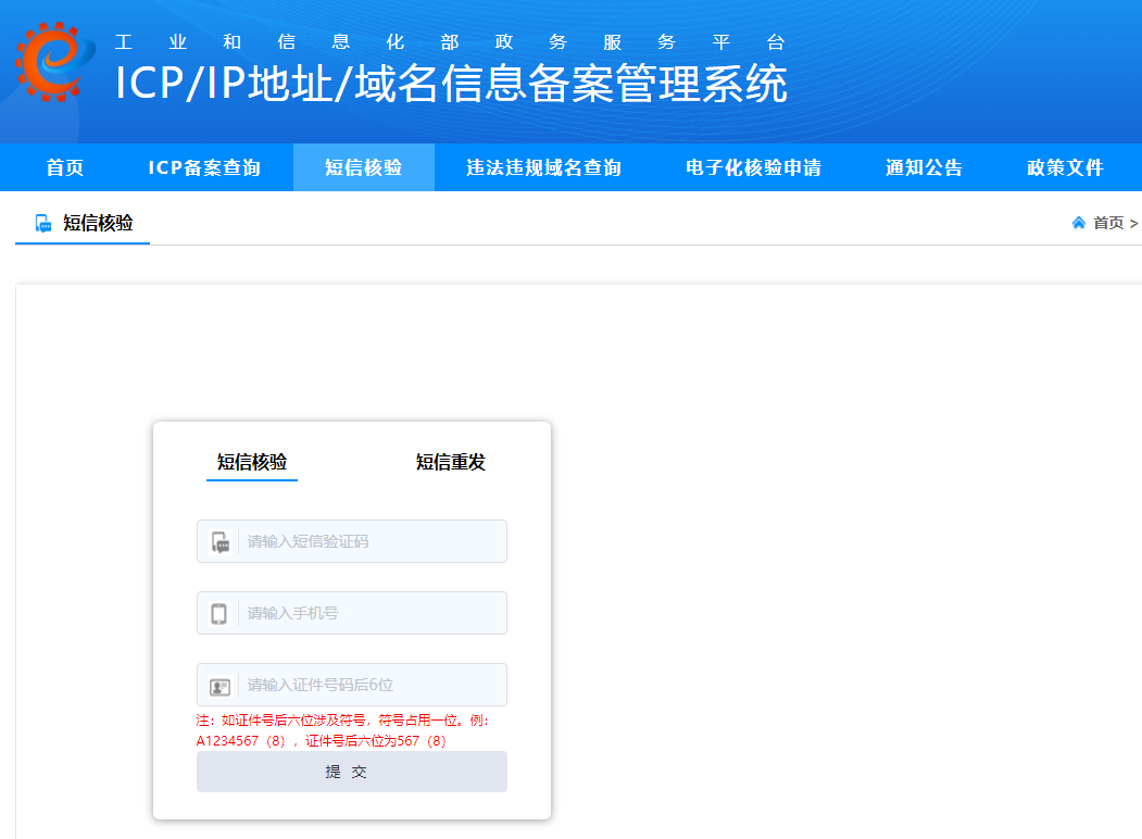 注意:手機號與主體負責人、網站負責人必須對應一致,否則將導致驗證失效。