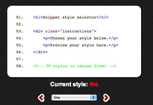 Snippet是一個很酷的jQuery語法高亮插件,基于SHJS腳本,你可以在SourceForge上找到源碼。