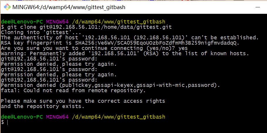 $ git clone git@192.168.56.101:/home/data/gittest.git