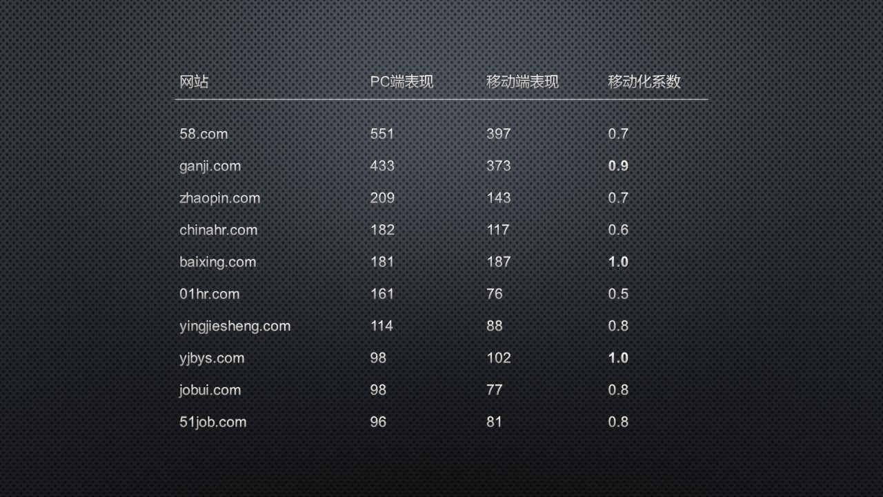 從該數據明顯可見的是,三大招聘網站(智聯、前程無憂、中華英才)的流量其實并不理想,其流量很顯著的差于58同城和趕集網。