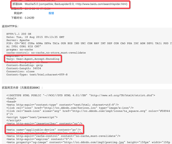 Vary header 加上之后,為了讓百度更好地識(shí)別我們的頁(yè)面是 PC 還是 Mobile,就需要使用百度自定義的這個(gè) Meta applicable-device 標(biāo)簽了。注意以下來(lái)自百度的消息: Meta applicable-device 標(biāo)簽,并非是站點(diǎn)必須標(biāo)注的,現(xiàn)在很多站點(diǎn)沒(méi)有標(biāo)記這個(gè)標(biāo)簽情況也很好。但這個(gè)標(biāo)簽可以幫助百度校驗(yàn)自己的判斷,并及時(shí)進(jìn)行修正。做這個(gè)事情又不麻煩,所以我們建議代碼適配站點(diǎn)為了保證效果,還是加這個(gè)標(biāo)簽。