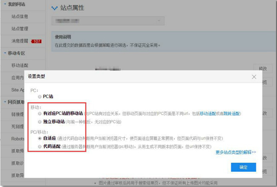 百度站在平臺(tái)的設(shè)置里,把網(wǎng)站分為了五類:PC站;有對(duì)應(yīng)PC站的移動(dòng)站;獨(dú)立移動(dòng)站;自適應(yīng)的站點(diǎn);代碼適配的站點(diǎn)。根據(jù)站點(diǎn)實(shí)際情況進(jìn)行設(shè)置,有利于百度蜘蛛在抓取頁(yè)面,以及搜索結(jié)果的排名(PC站和M站的搜索結(jié)果展現(xiàn)機(jī)制不一樣)。設(shè)置方法如下: