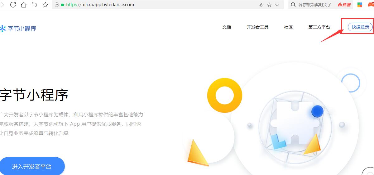 (1)登錄字節(jié)跳動小程序官網(wǎng) https://microapp.bytedance.com/ 點擊右上角的“快捷登錄”,進(jìn)行帳號注冊。