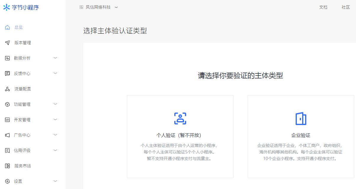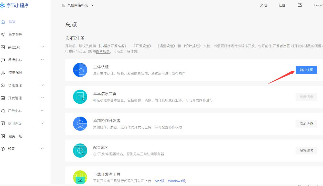(1)創(chuàng)建完成后,自動進(jìn)入到【小程序總覽頁】,點擊【去認(rèn)證】,進(jìn)行主體認(rèn)證。