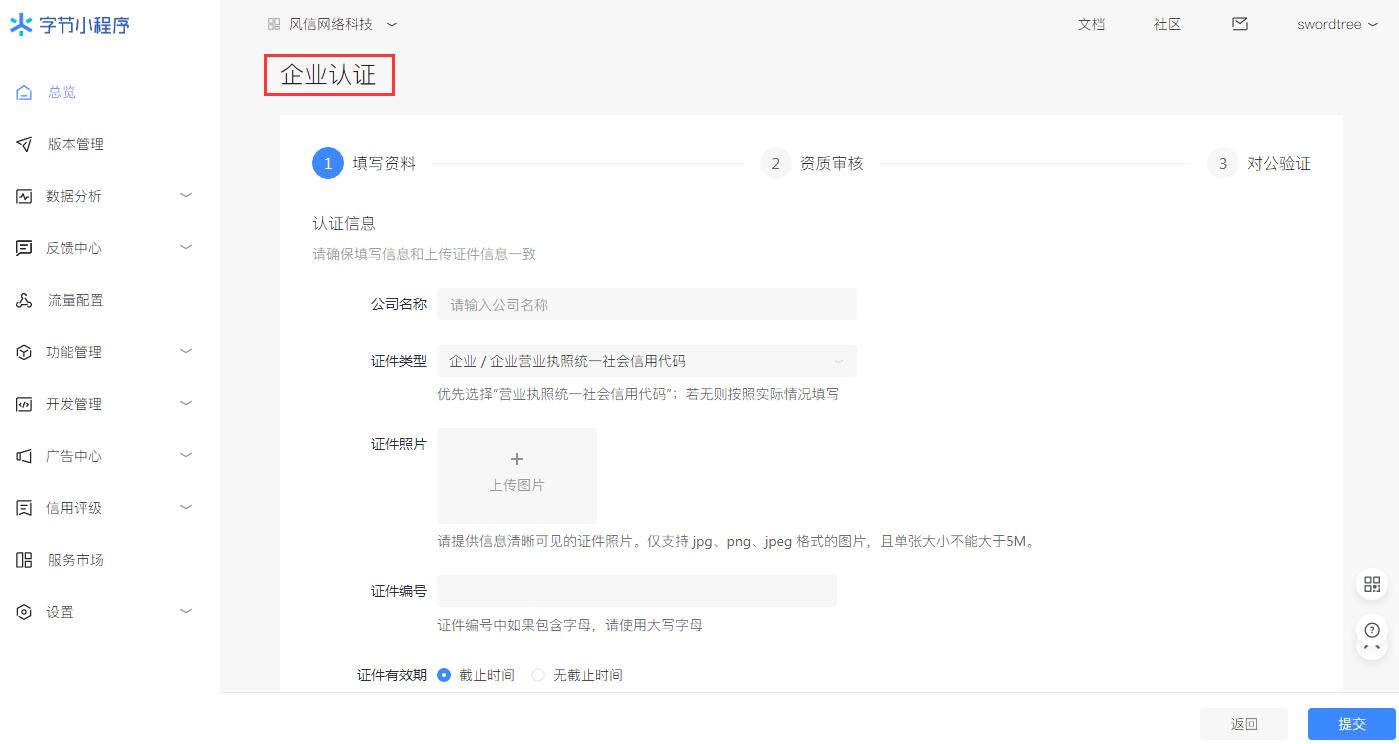 企業(yè)級認(rèn)證有三個步驟:填寫資料-資質(zhì)審核-對公驗證,請根據(jù)提示完善信息。