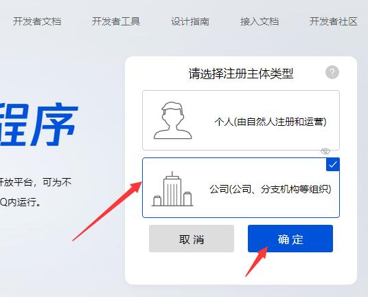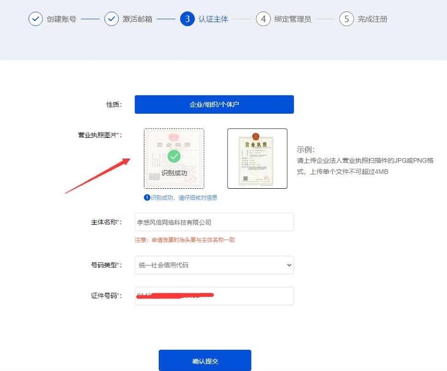 我們以企業類型作為主體進行下面的操作,按照提示,上傳營業執照圖片,填寫主體名稱、統一社會信用社代碼,然后點擊確認提交。