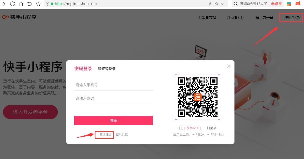 (1)登錄快手小程序官網 https://mp.kuaishou.com/ 點擊右上角“注冊/登錄”,“立即注冊”,進行帳號注冊。