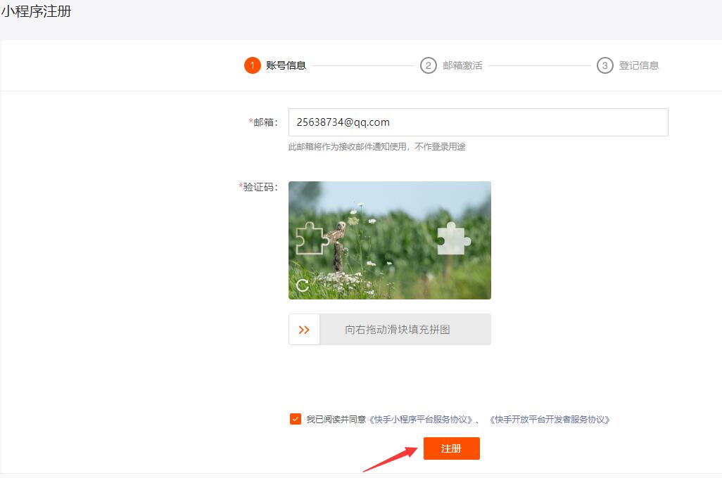 進入“小程序注冊”界面,填寫帳號信息:郵箱、驗證碼,勾選服務協議,然后點注冊。