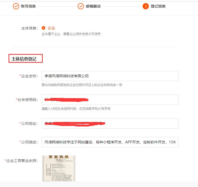 填寫“主體信息登記”,企業全稱,社會信用碼,公司地址,公司描述,上傳工商營業執照