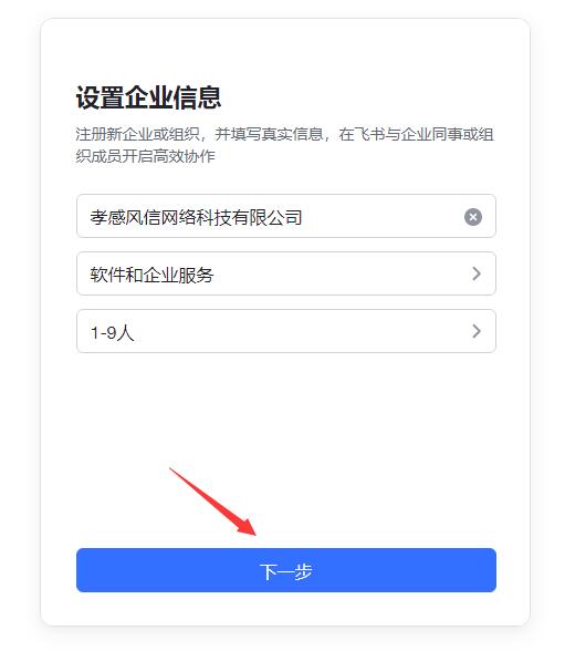 進入“設置企業(yè)信息”界面,填寫真實的企業(yè)名稱,選擇行業(yè)類型、人員規(guī)模,點下一步。