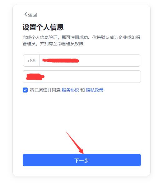 自動進入“設置個人信息”界面,填寫手機號、姓名,勾選服務協(xié)議,點下一步。