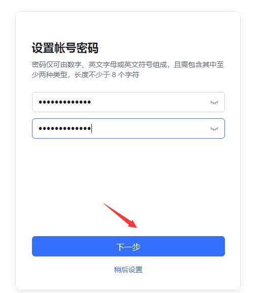 輸入手機驗證碼后,自動進入“設置帳號密碼”界面,設置密碼,然后點下一步。